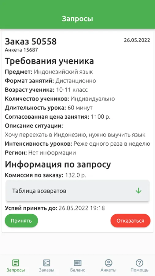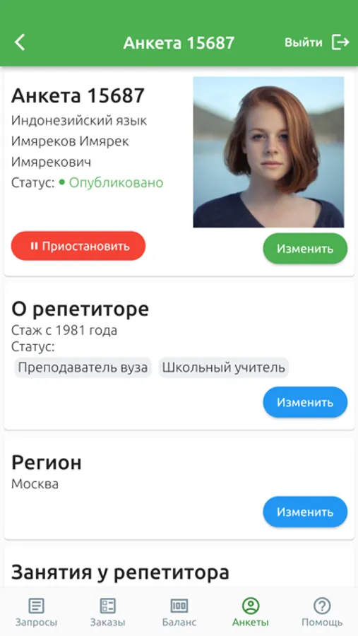 Репетитор, использующий приложение, с большей надежностью получает информацию об отклике на свое объявление, он может в приложении посмотреть информацию, сообщенную клиентом. Приложение позволяет оперативно отредактировать анкету, изменить допустимые часы и стоимость занятий.