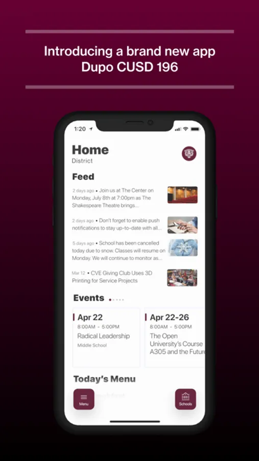 The event section shows a list of events throughout the district. Users can add an event to their calendar to share the event with friends and family with one tap.