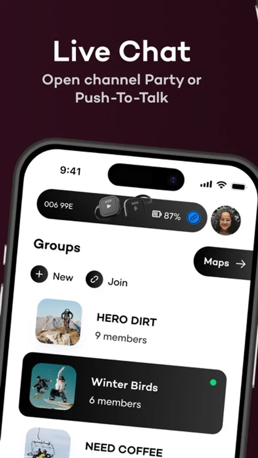 Aleck provides unlimited range, hands-free group communication via cell networks. Groups can select the open channel Party Mode or standard Push-to-Talk (PTT) which functions like a walkie-talkie. Skiers and snowboarders can have a family group, a big friend group, an all-mountain squad and their park people at their fingertips with ease. When that sloucher friend finally gets to the hill, adding them remotely can be done on the fly.