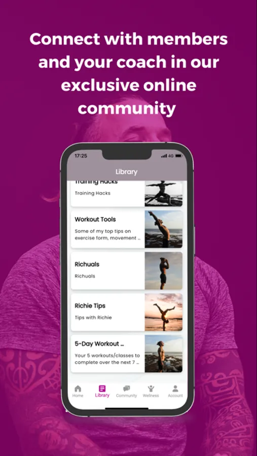 The app is designed to help all levels of fitness and ability. You can choose how many days per week you would like to practice and choose from the abundance of new delicious recipes. You will be provided with a mix of strength workouts, yoga, mobility, stretching, breathwork, and direct coaching with Richie.