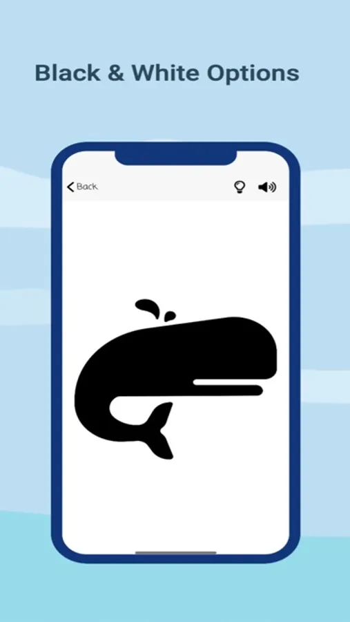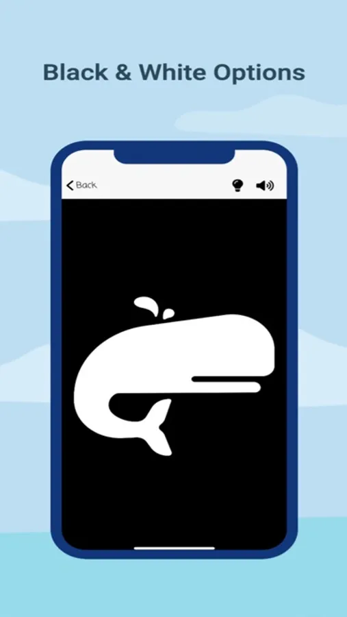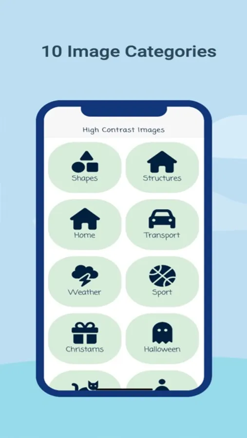 Two free categories with 10 images in each, including shapes and structures. Ability to turn on sound for auditory stimulation and switch contrast from white to black and vice versa.