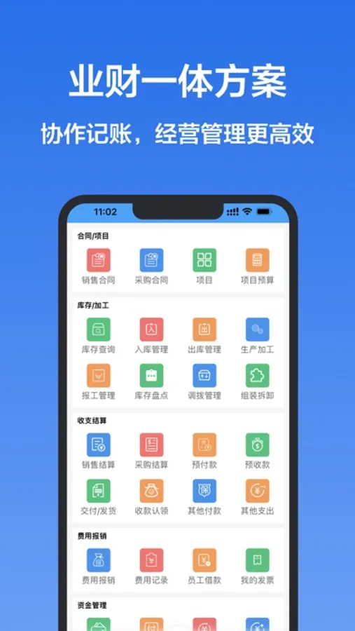 订单管理,项目核算,预算管理,库存管理,生产加工,BOM,收支结算,费用报销,发票管理,资产/工资表,资金管理,自动会计,业绩统计,多工资核算功能一应俱全,全方面满足您的生产经营需求。