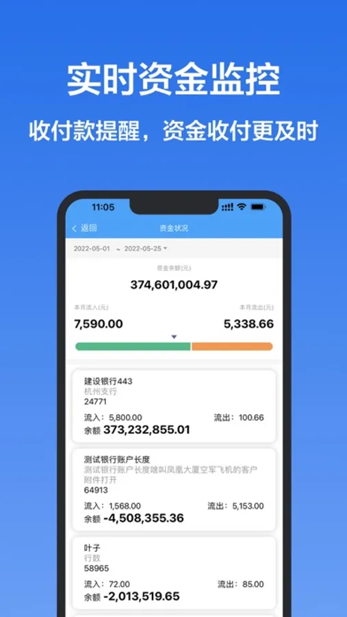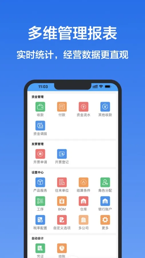 实时财务:实时提供多维度报表,随时随地掌控财务状况企业,辅助老板轻松决策。
