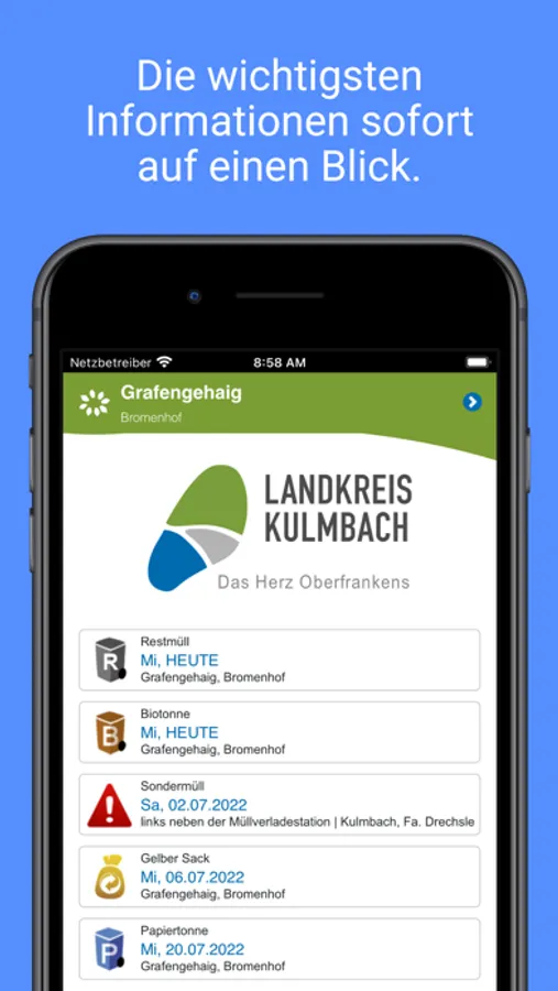 Die neue Abfall-App des Landkreises Kulmbach. Bleiben Sie immer informiert - über Abfuhrtermine, Annahmestellen, Problemmüll und vieles mehr.