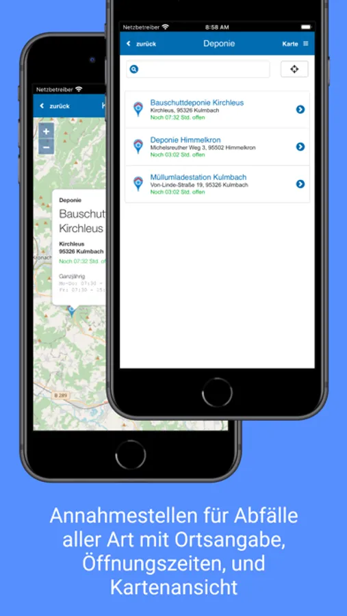 * Annahmestellen für Abfälle aller Art mit Ortsangabe und Öffnungszeiten, inkl. Kartenansicht und Navigation.