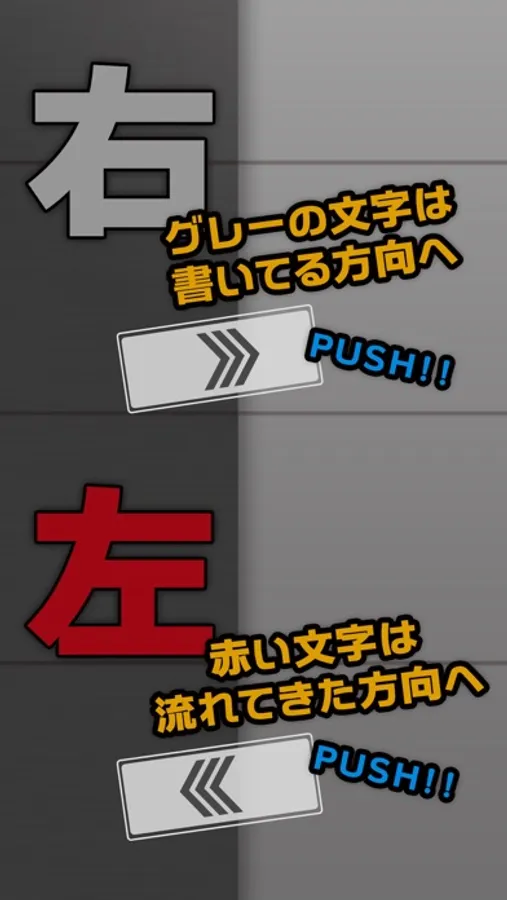 上から流れてくる左右の文字を色ごとのルールに従って振り分けるゲームです。