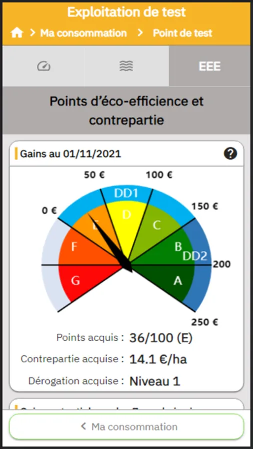 3/ un onglet éco-efficience pour suivre le score de performance de l’irrigation et les contreparties acquises en cours de campagne.