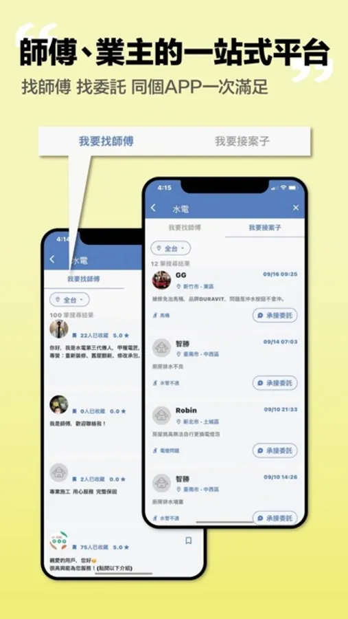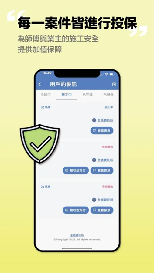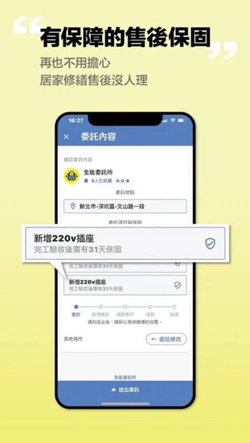 我們非常重視師傅的專業技術及安全保障,不僅會為每一案件加保保險,平台也有提供保固的服務。