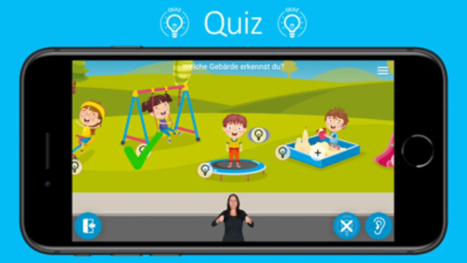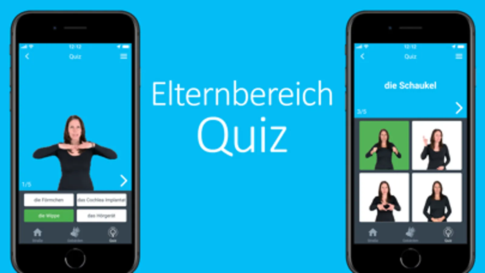- Quiz: Im Quiz kann der Lernfortschritt überprüft werden. Es kann gefiltert werden, ob alle Gebärden oder nur Gebärden aus einzelnen Bereichen abgefragt werden sollen. Außerdem kann gewählt werden, ob das Wort zur Gebärde oder die Gebärde zum Wort gelernt wird.