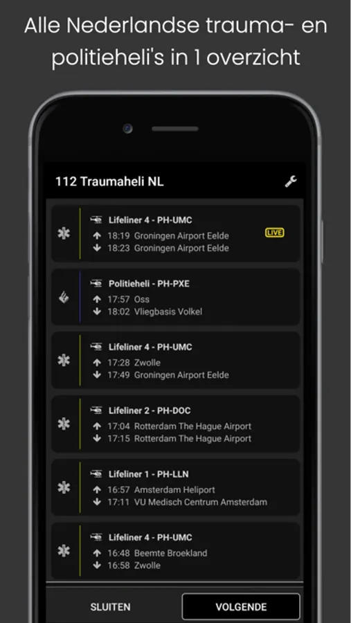 Ook de oproepen, P2000 meldingen, van de helikopters zijn zichtbaar in de app. Je kunt bijvoorbeeld Lifeliners 1, 2 en 3 terugvinden maar ook politiehelikopters. Alle belangrijke heliports, medische centra en vliegvelden worden vermeld.