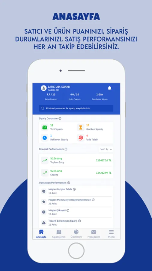 Satıcı puanı, ürün puanı ve gönderim sürenizi görebilirsiniz.