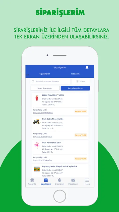 - Siparişlerinizi Servisli Siparişler ve Kargolu Siparişler olarak ayrı ayrı takip edebilirsiniz.