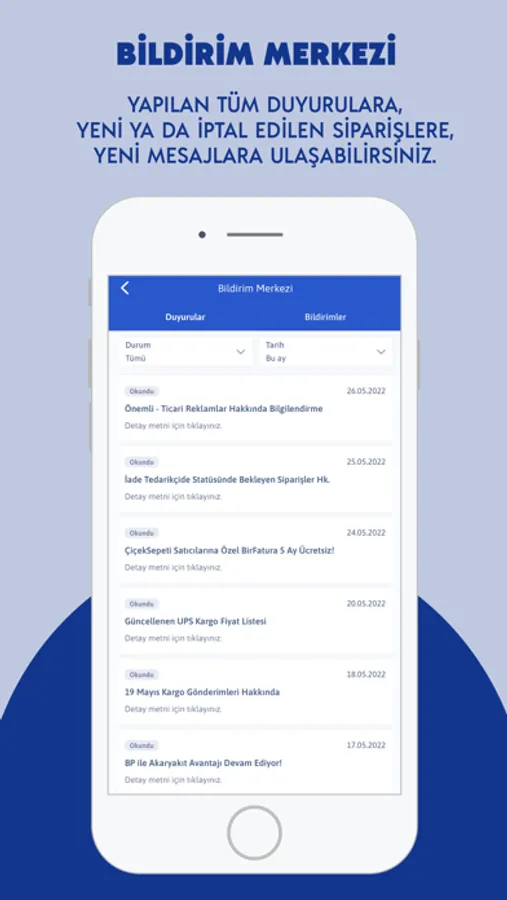 Yeni sipariş oluşması, bir siparişin iptal edilmesi veya yeni mesaj gelmesi gibi durumlarda gelen bildirimleri takip edebilirsiniz.