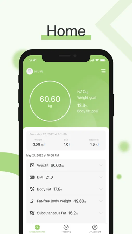 AI×Scaleは体重計と接続し、体重・体脂肪率など13項目の測定データをグラフ化し、健康管理をサポートします。