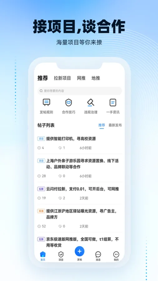 本APP是一个免费发布合作信息的平台,用户也可以免费查看他人发布的合作信息,我们是一个项目合作拓展平台