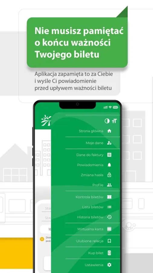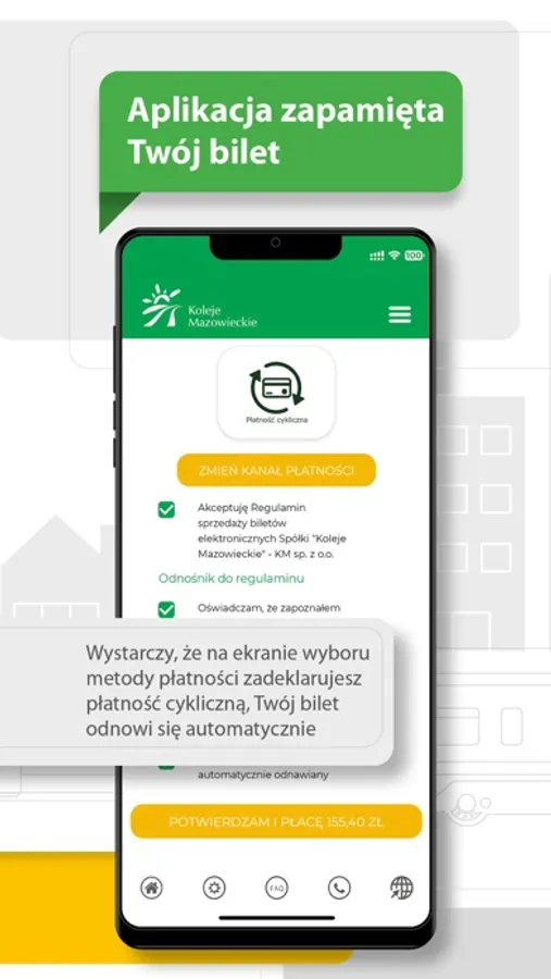 W aplikacji po utworzeniu Wirtualnej Karty Mazowieckiej kupisz bilet okresowy. Okazując bilet do kontroli nie musisz mieć dostępu do Internetu, bilet jest dostępny również w trybie offline. Aplikacja powiadomi Cię o zbliżającym się końcu terminu ważności twojego biletu okresowego. Umożliwi Ci "zapamiętanie" kupowanego przez Ciebie biletu wielokrotnego. Jeśli na ekranie wyboru metody płatności zadeklarujesz płatność cykliczną, Twój bilet odnowi się automatycznie. Aplikacja oferuje Ci bezpieczne płatności, a jako jedną z nich płatność odroczoną, którą możesz podzielić również na raty. Dzięki tej formie płatności za bilety długookresowe zapłacisz nawet 30 dni po zakupie.
