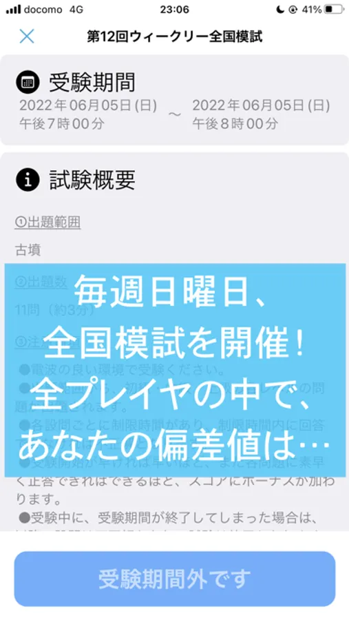 - 週に一度、ウィークリー全国模試を開催。出題範囲が事前に公開されるので、重点的に範囲を予習し、試験に臨んでみてください。成績優秀者はランキング公開!あなた自身の結果や全国偏差値などの情報もフィードバックされますので、今後の学習の参考にしてください。