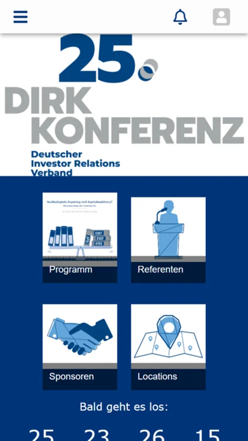 Am 20. und 21. Juni 2022 treffen wir uns im Steigenberger Airport Hotel Frankfurt zur 25. DIRK-Konferenz, um mit Ihnen unter dem Motto "Nachhaltigkeits-Reporting statt Kapitalmarktstory? Befreiungsschlag oder Schwitzkasten" die aktuellsten Themen rund um Investor Relations zu diskutieren. Es warten wieder spannende Workshop-Sessions zu den Themen ESG, der Digitalisierung, der virtuellen Hauptversammlung und vieles mehr auf Sie. In der Konferenz-App finden Sie die vollständige Agenda inklusive Kurzbeschreibungen aller Vorträge, Kurz-CVs der Referenten sowie Informationen zu unseren Sponsoren-Partnern.