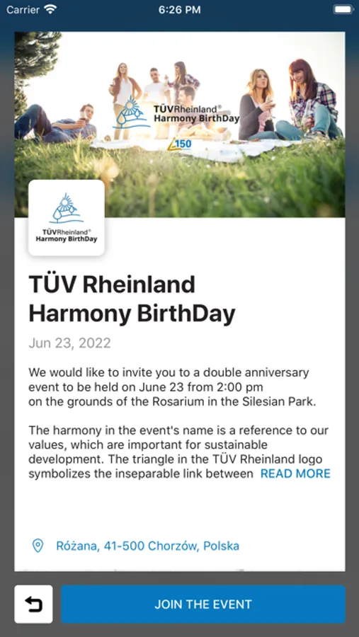 TÜV Rheinland Harmony BirthDay odbędzie się 23 czerwca od godziny 14:00 na terenie Rosarium w Parku Śląskim. W aplikacji znajdziecie szczegółowy program wydarzenia, opis atrakcji, mapkę terenu, rozkład jazdy autobusów powrotnych oraz odpowiedzi na najczęściej zadawane pytania. Dzięki aplikacji w dniu imprezy będzie można gromadzić punkty za udział w warsztatach i atrakcjach. Dla osób z największa liczbą punktów przewidziane są nagrody.