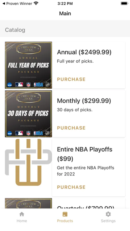 Proven Winner's official client management application. Shop all of our package options, and never miss another pick with our one-of-a-kind client dashboard. With the client dashboard clients can view all of the picks associated with their subscriptions, as well as upgrade their pick packages. Admin users will be pushing picks in real-time to the associated packages so make sure to have your notifications on!
