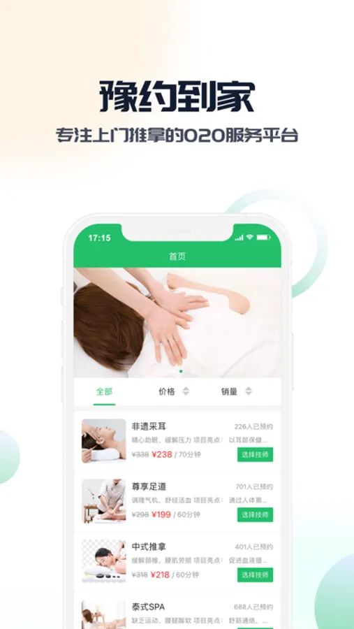 【豫约到家】是一家以推拿为主,个人定制为辅的o2o平台,本平台提供专业、正规、安全、便捷的24小时上门推拿服务。您可以查看技师的详细介绍(距离、头像、从业经验、状态、评论),服务项目并进行下单支付。技师收到您的支付订单会第一时间联系您,全程联系设置隐私保护并进行录音。本平台承诺:不满意可退款(在本平台服务范围内,因技师手法和态度不满意,经调查属实后,平台无理由退款)