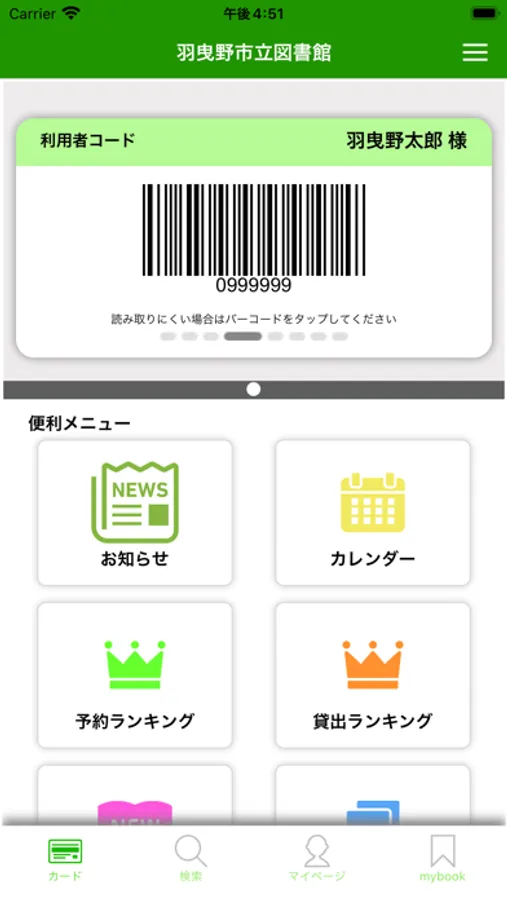 アプリにバーコードを表示させ、図書館利用カードと同じように図書館で使用できます。