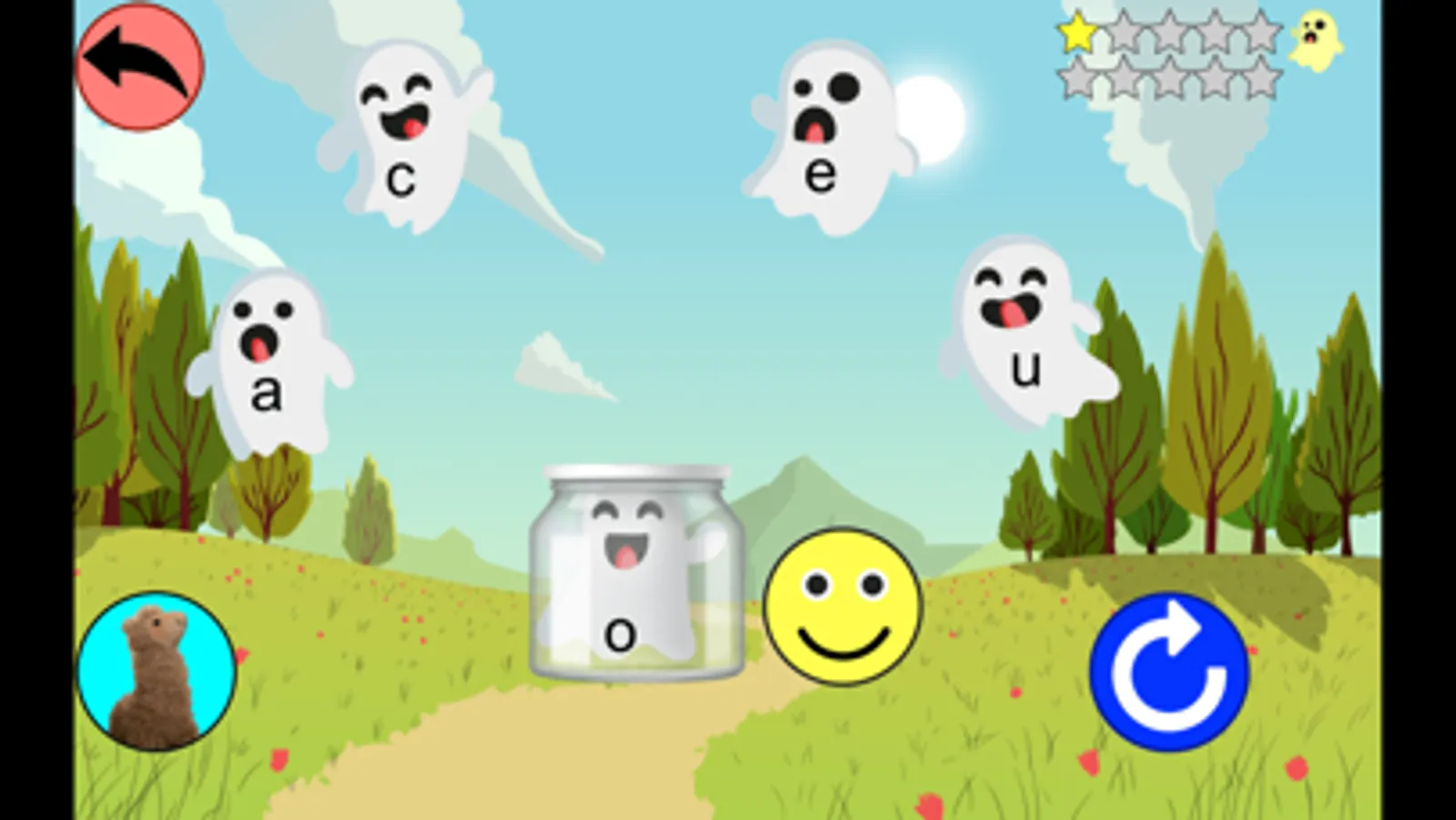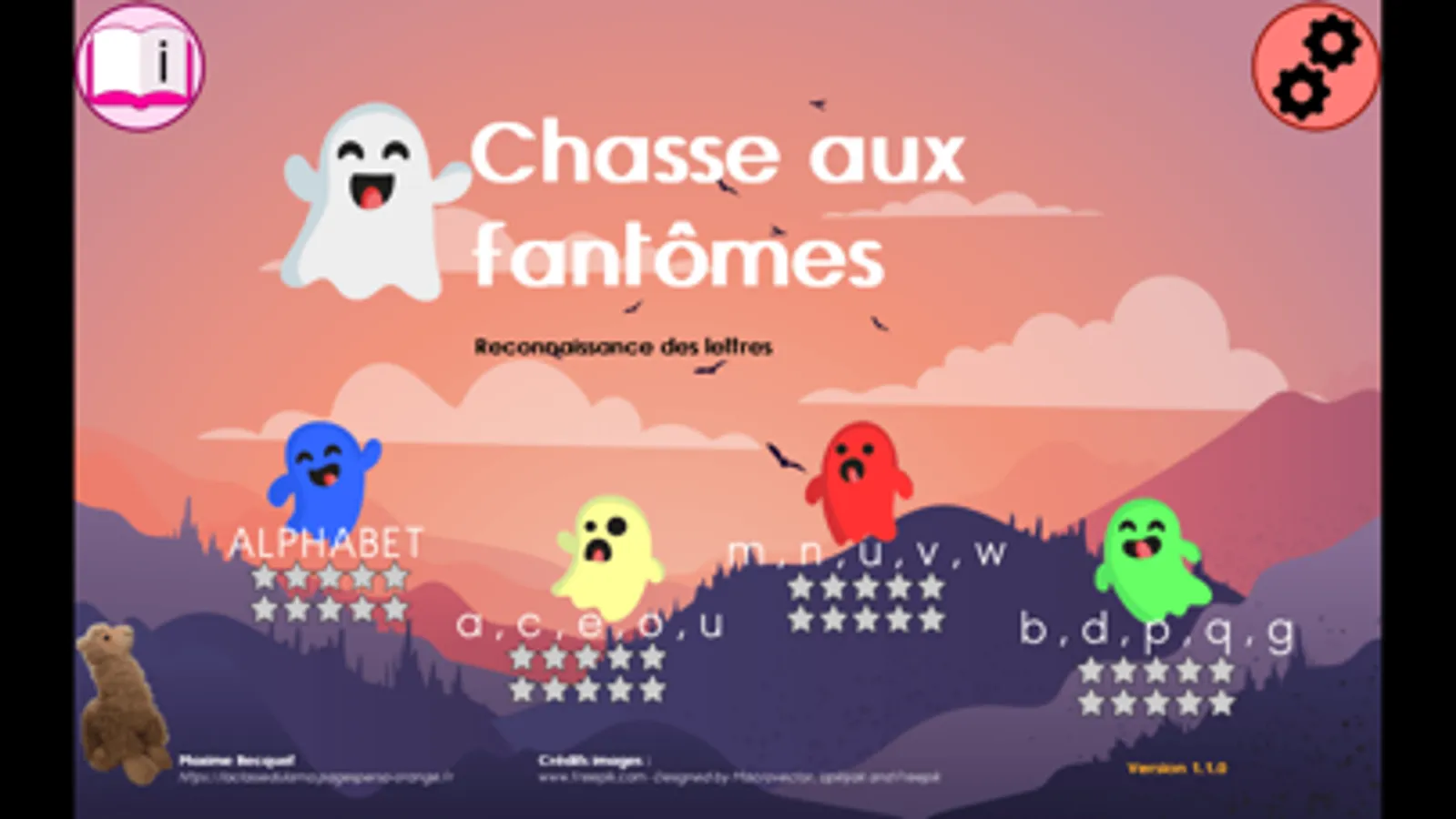 Chasse aux fantômes propose de travailler la reconnaissance des lettres. Il faut glisser le fantôme qui a pris la lettre indiquée dans le pot.