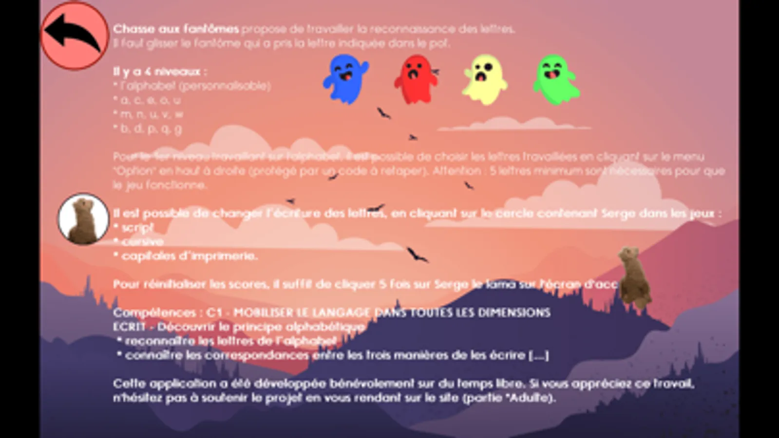 Pour le 1er niveau travaillant sur l'alphabet, il est possible de choisir les lettres travaillées en cliquant sur le menu "Option" en haut à droite (protégé par un code à retaper). Attention : 5 lettres minimum sont nécessaires pour que le jeu fonctionne.
