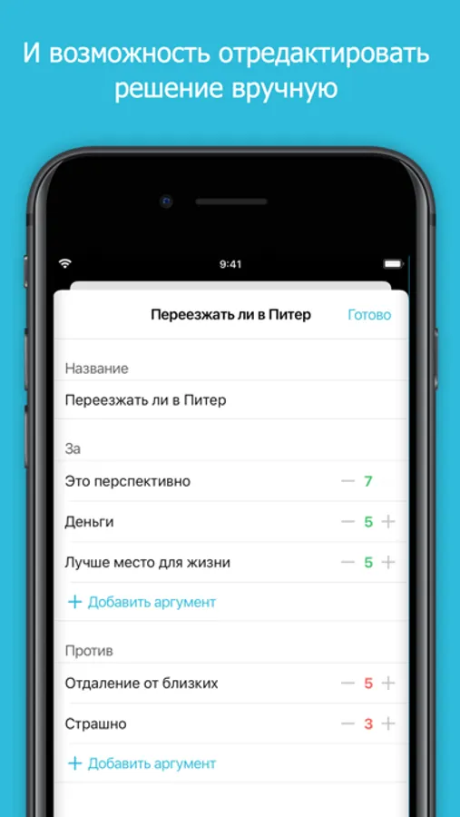 Приложение поможет снизить неопределенность принимаемого решения, разложить все по полочкам. Каждый аргумент получит свой вес. Ничего не уйдет из фокуса вашего внимания.