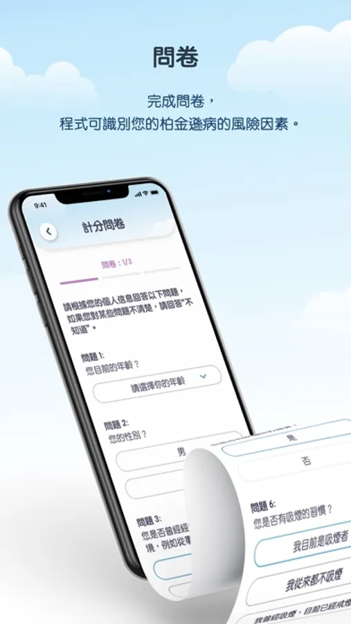 柏金遜病是老年人群常見的腦退化病。基於先前的研究結果,在柏金遜病運動症狀出現前有一個漫長的早期階段。本應用程式通過問卷評估以及認知測試對其風險因素進行篩查,預估將來可能患柏金遜病的風險。