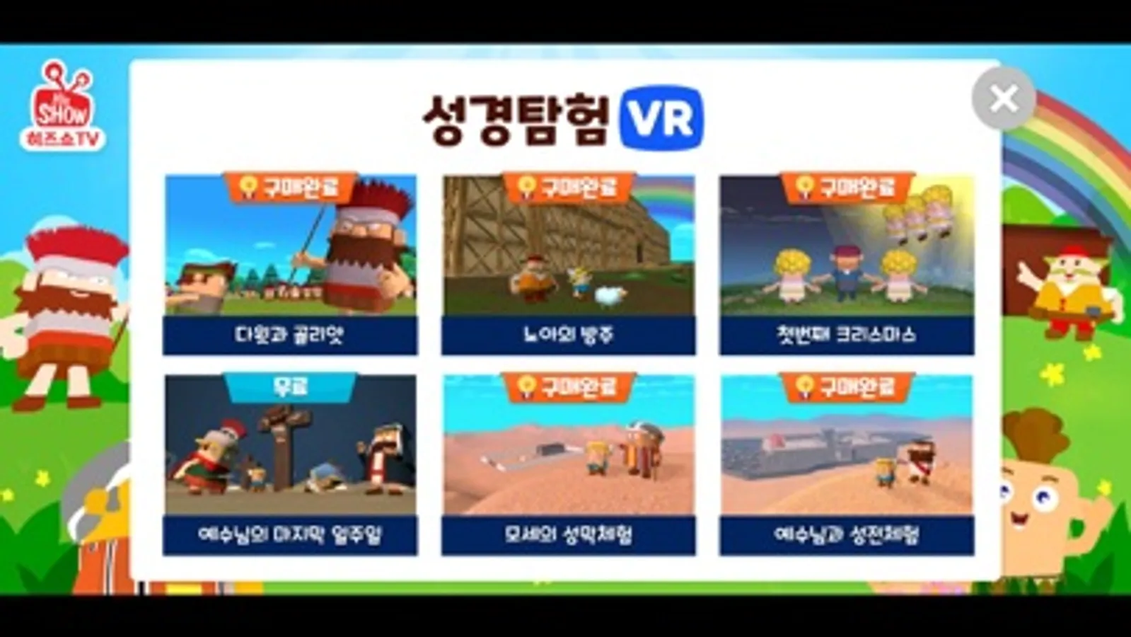(VR성경탐험)은 다윗과 골리앗, 노아의 방주, 첫번째 크리스마스, 십자가 사건, 성막체험, 성전체험으로 구성되어 있습니다. 히즈쇼 성경애니메이션을 통해 이미 아이들에게 친숙한 성경 속 캐릭터들이 VR콘텐츠로 아이들의 눈 앞에 살아납니다. 아이들의 시선을 360도 돌려가며 성경 속 장면에 참여할 수 있으며, 시선 클릭으로 VR 속 상황에 반응할 수 있습니다.