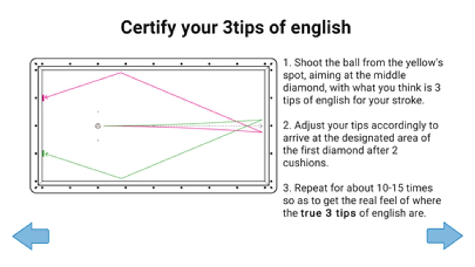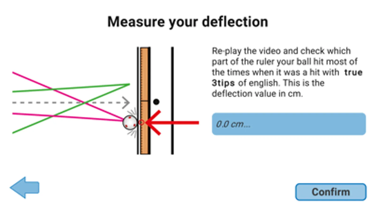 1. Setup the application as per your current cueing action results and relevant deflection. You will always bill able to re-setup your personal cueing parameters, should you change cue, cue tip, shaft or even cueing action. Therefore it will always assist you with your current player characteristics, thus helping you to incorporate any change in style or gear and improve faster.
