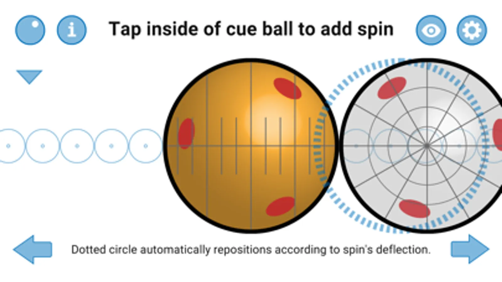 By simulating the produced deflection, based on tips of english and distance between cue ball/object ball, Billiards Aiming Assistant will create a dummy ball, always locked on the cue ball, representing the cue ball's deflection augmented position, prior to contacting the object ball. Slide the dummy ball to the desired thickness and you will get the simulated true cue ball position for your aim.
