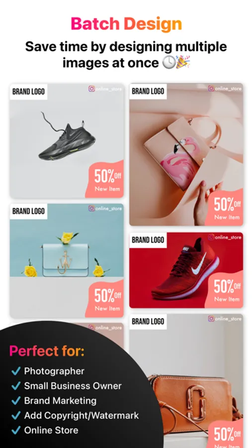 * Save a huge amount of time. Watermark and design multiple photos at once seamlessly even with different aspect ratios.
