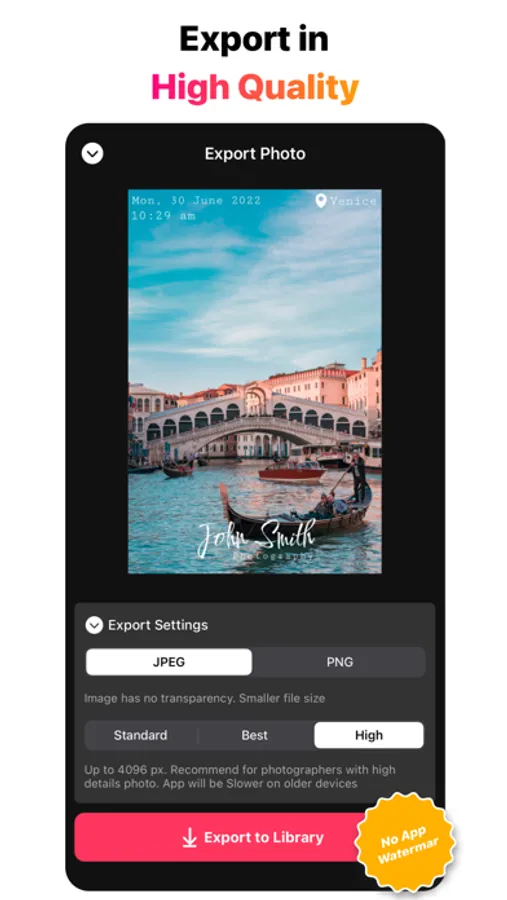 * Save your work as a template project. Reapply your watermark later to new photos with a single tap.