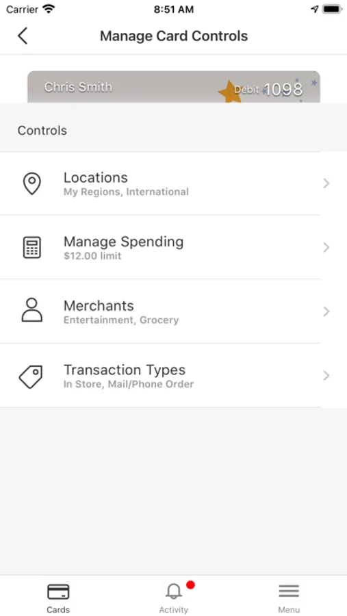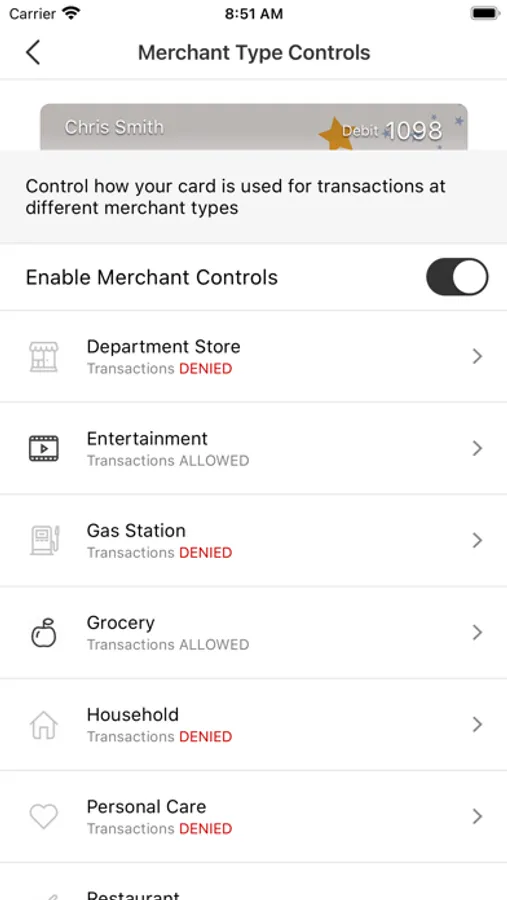 Spending limits can be established to allow transactions up to a certain dollar value and decline transactions when amounts exceed your defined thresholds. Transactions can be monitored and managed for specific merchant categories such as gas stations, department stores, restaurants entertainment, travel, and groceries. And your transactions can also be monitored for specific transaction types: in-store purchases, e-commerce transactions, mail/phone orders and ATM transactions.