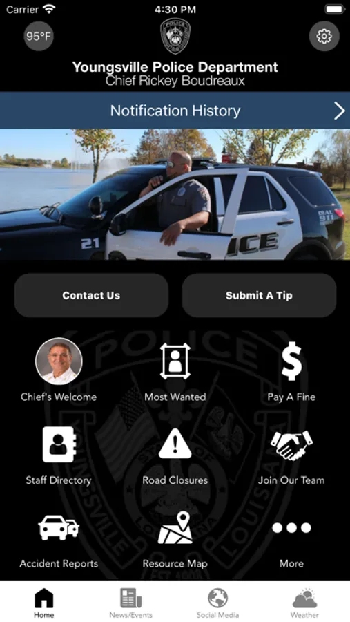 The Youngsville Police Department mobile application is an interactive app which will help improve our communication with the citizens of Youngsville and surrounding area. The purpose of this app is to improve our ability to communicate with our citizens Information which will include, but not be limited to Push Notifications, Submit a Tip, Weather Forecast and more. Citizens may submit a crime tip directly through the app, as well as see and share social media posts. By empowering people through technology, the Youngsville Police Department will be able to better protect our community..