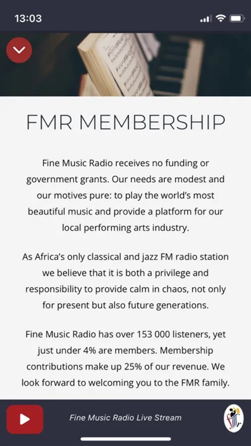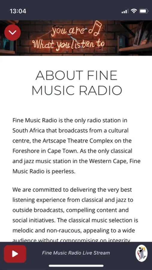 Pop an orchestra into your pocket with Fine Music Radio’s app. We are now with you 24/7 wherever you are and whatever you’re doing. You can listen to the world’s most beautiful music, classical and jazz, via live streaming. As Africa’s only FM classical and jazz radio station we have our pulse on what is happening in the arts’ world with interviews with leading local and international performers. Plan your listening by downloading our a monthly schedule, listen to podcasts, view our gallery and contact us directly via email. If you’re seeking calm in chaos simply press play.