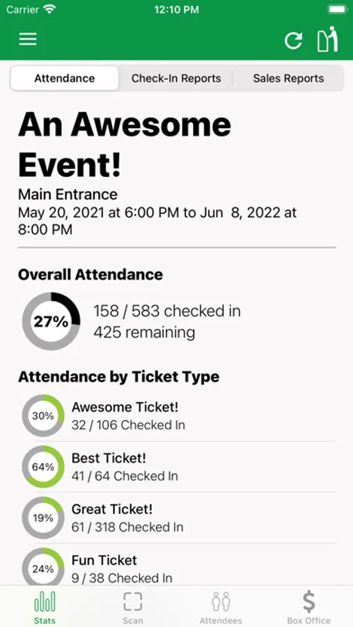 - Up to the minute view of the check-in progress for your event, see how many you have checked in with our easy to read attendance progress bar
