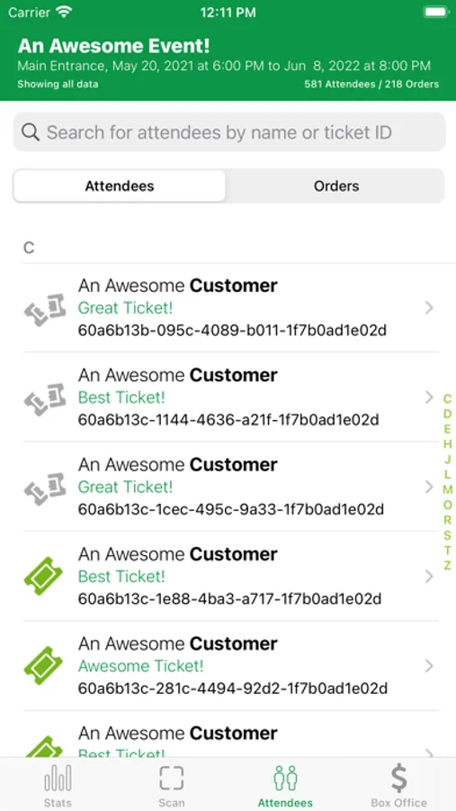 - Easily find attendees through the search of last name, ticket number, or order confirmation number