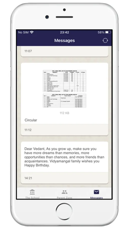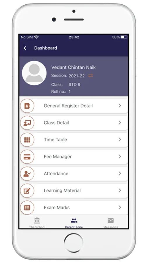(2) Parent Zone - Parents can see their kid's personal records in this section. For example - General Register details, Time Table, Attendance, Exam Results, Fee Payment details, Home Work etc. Parents will have to register into the app using the same mobile number which is supplied for school General Register record.