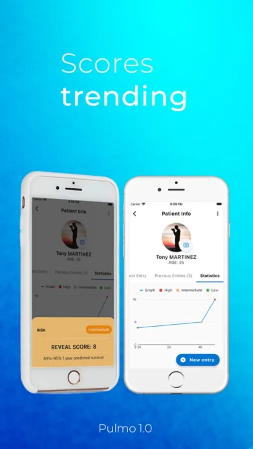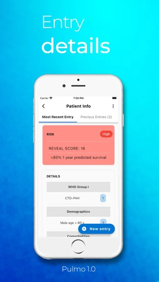 The Reveal 2.0 calculator is a risk score (Reveal score) calculator that calculates risk scores for pulmonology hypertension patients. The scores allow the pulmonologist to provide proper and more efficient patient care. The app also allows for score analysis and trending over time. There are two Pulmo apps. The standard and the enterprise versions.