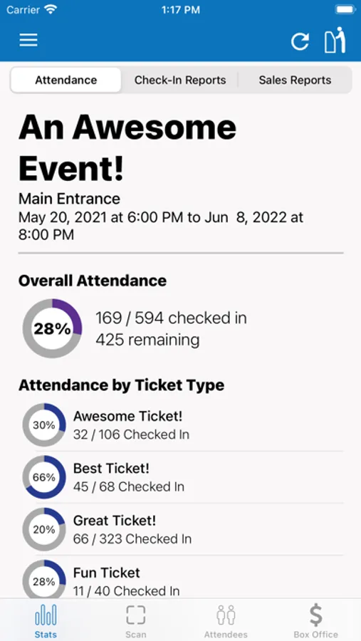 - View the check-in progress for your event down to the minute and see how many attendees have been checked in with our easy to read status bars