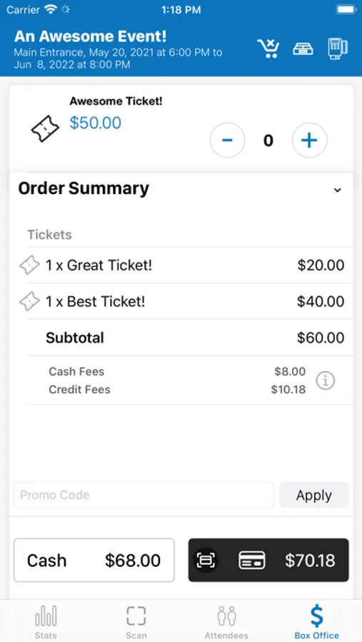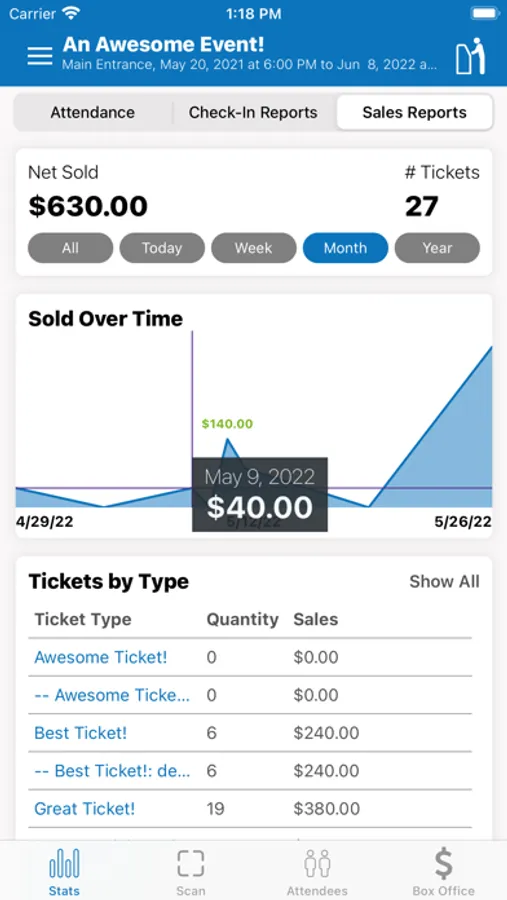This app gives you all the tools you need to run a successful event with us! Transform any iPhone, iPad or iPod touch into a full-service system that will allow you to view live sales stats, Check-In attendees and even the ability to sell tickets on-site!