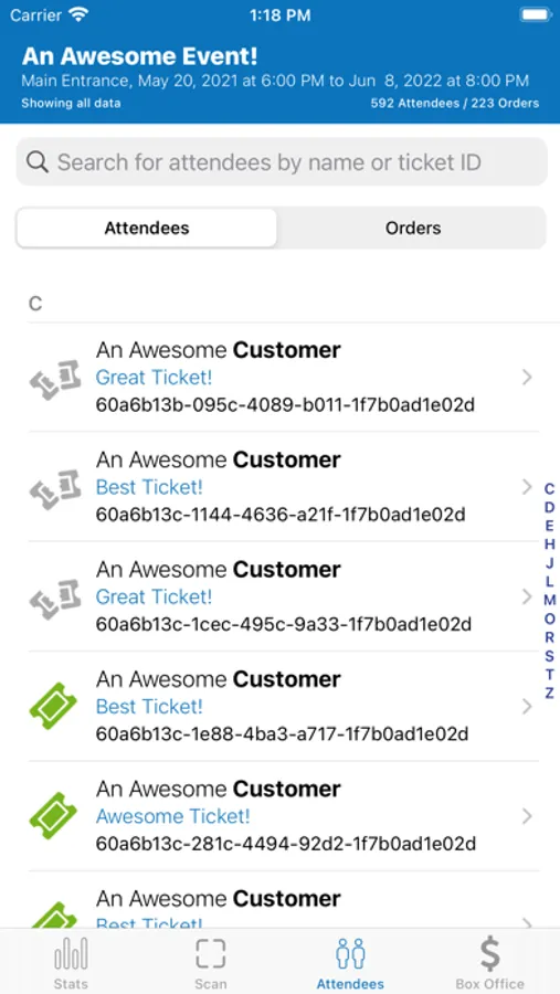 - Easily search for attendees through the search of their last name, ticket number, or order confirmation number