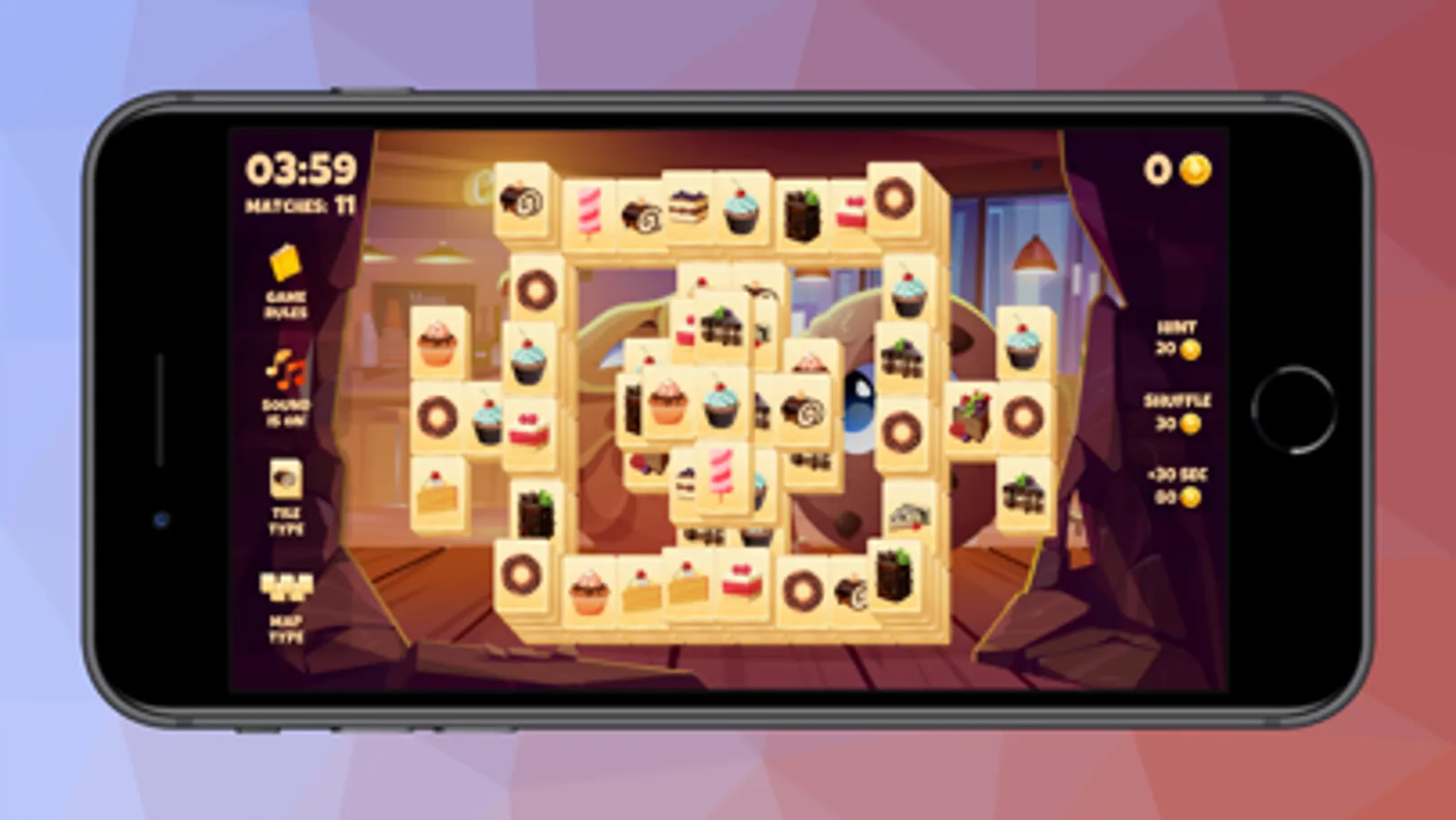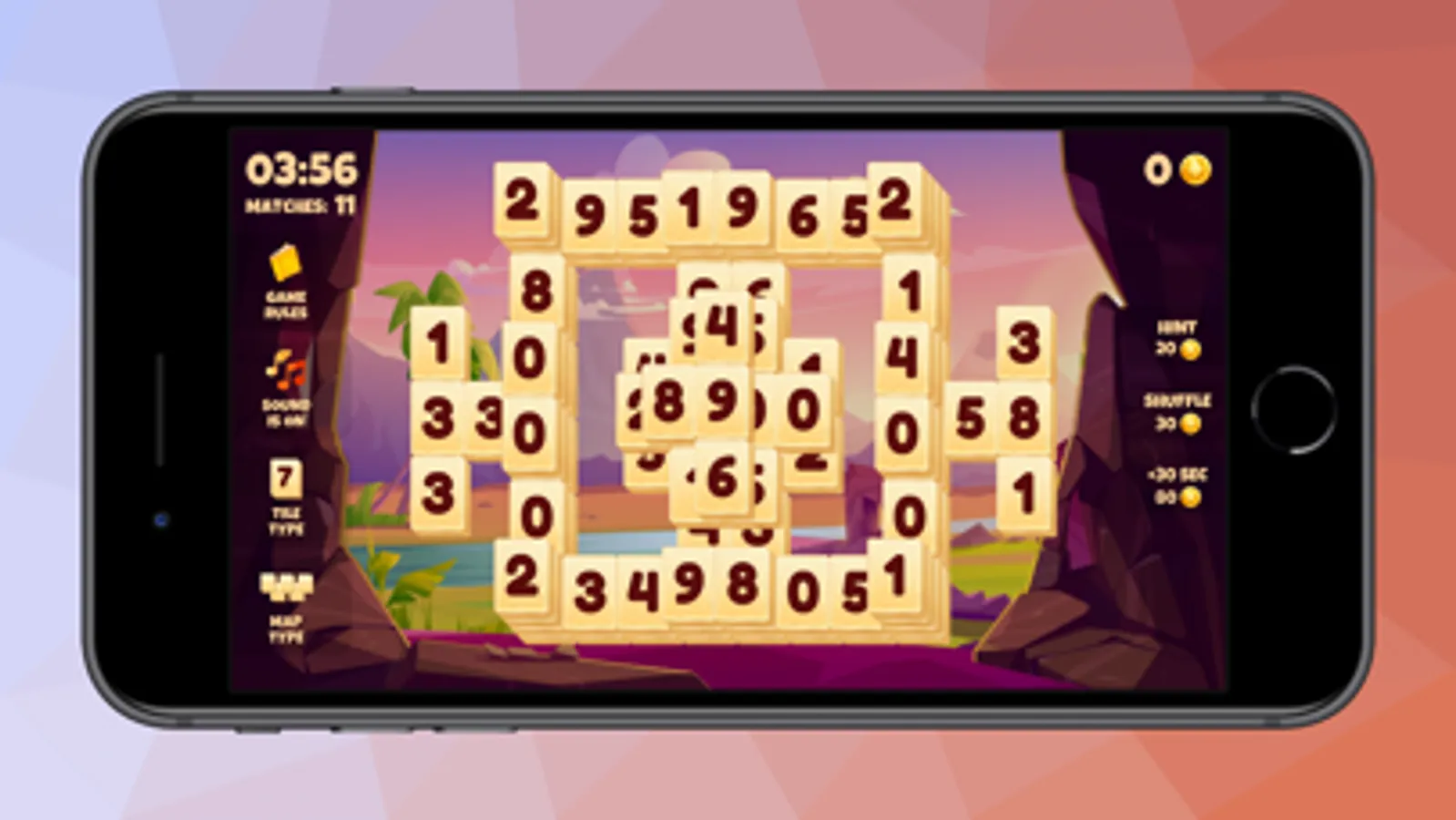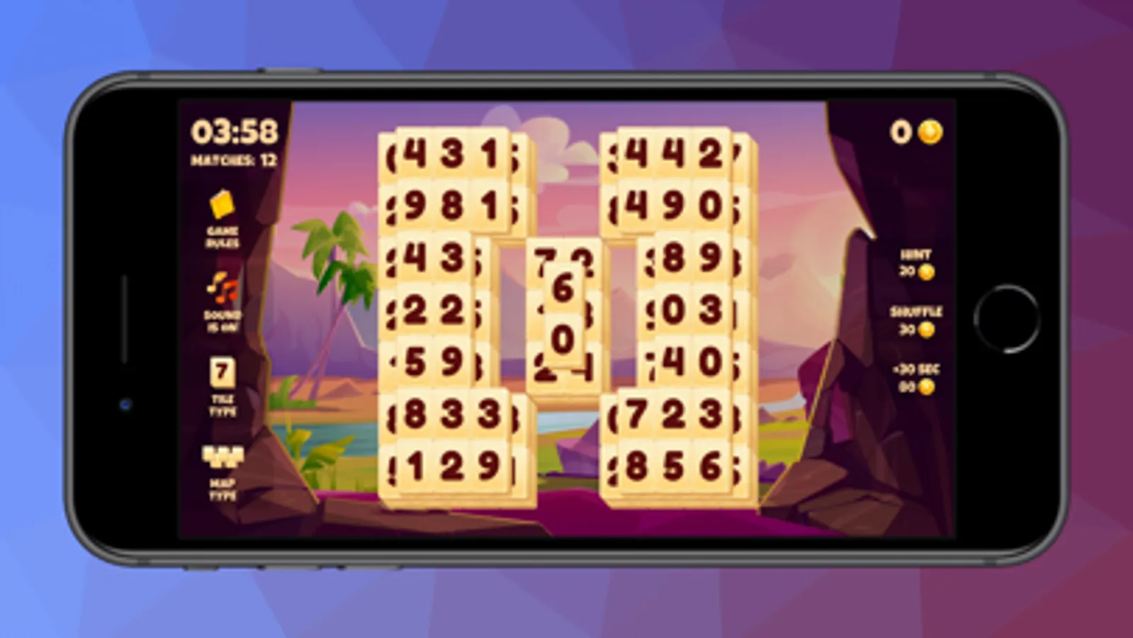 Enjoy the classic Mahjong Solitaire game, and match tiles with the same numbers.