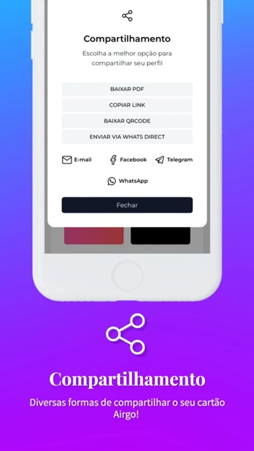 O Airgo também oferece incluso a possibilidade de baixar sempre que quiser e atualizado uma versão em PDF do seu perfil para compartilhar com os seus contatos via WhatsApp ou e-mail, suporte prioritário e assistente para deixar o perfil mais estético seguindo a identidade visual da sua marca. Além de compartilhar o seu cartão de visitas digital por aproximação, você também pode baixar o QR Code do seu perfil em nosso APP e compartilhar o seu link personalizado sempre que quiser.