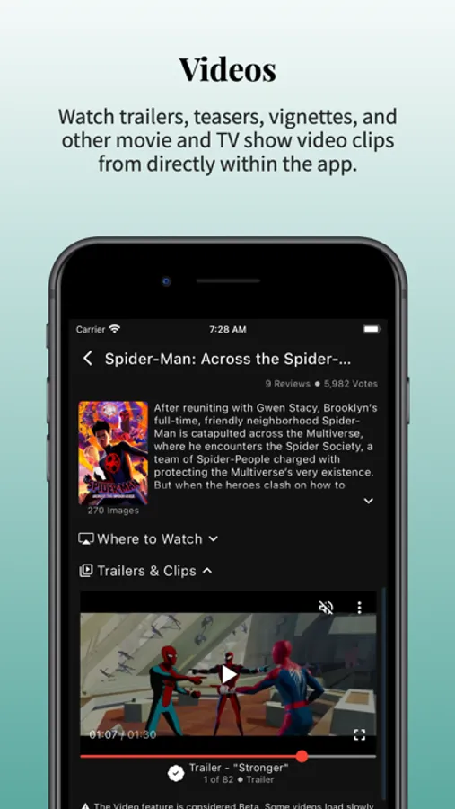 - *Videos* -- Watch trailers, teasers, vignettes, and other movie and TV show video clips from directly within the app. (You cannot watch full length movies in the app.)