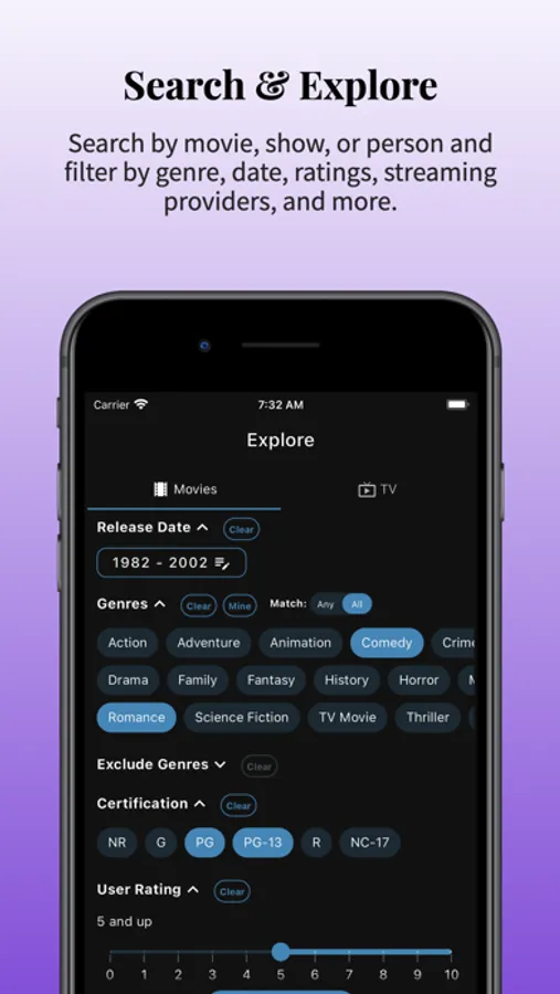 *Explore: Your Curated Entertainment Journey* -- Feeling adventurous but not sure what to watch? Our Explore page is your gateway to discovery. Set filters based on year range, genre, certification, user rating, runtime, and even specific streaming providers. Watch as the number of matching results updates instantly with each filter you apply. It's exploration made easy and exciting.