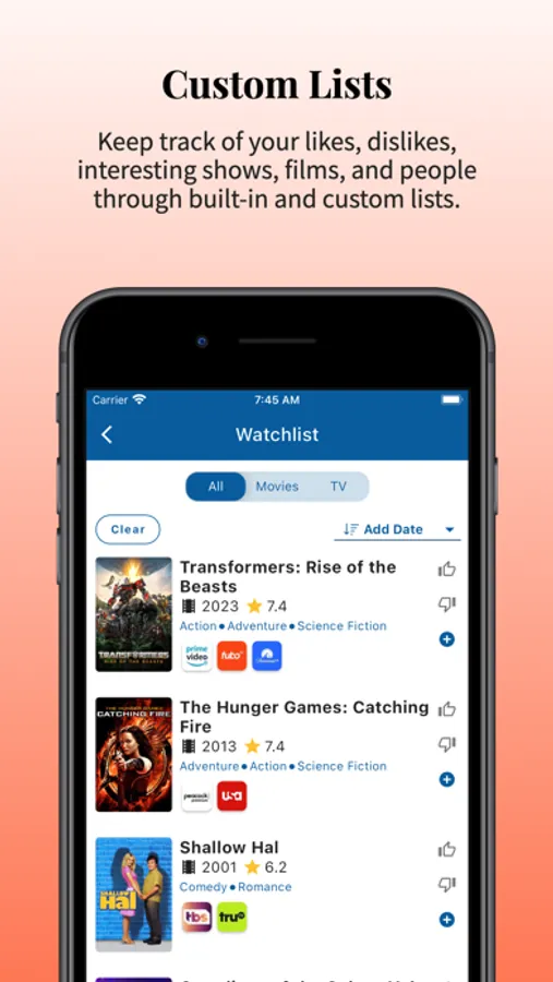 - *Likes, Dislikes, and Lists* -- Keep track of interesting shows, films, and people through built-in as well as custom lists.